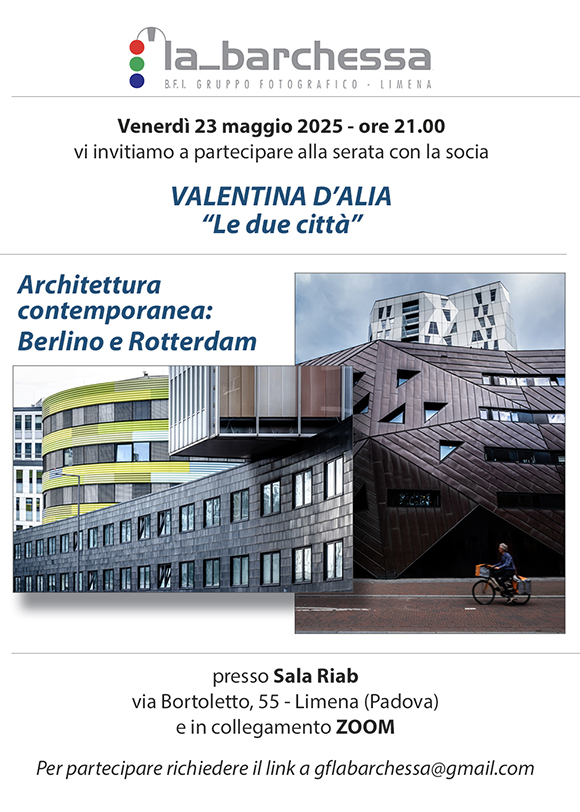 Venerdì 23 maggio 2025 alle ore 21.00 la nostra socia Valentina D'Alia ci presenterà "Le due città - Architettura contemporanea a Berlino e Rotterdam".