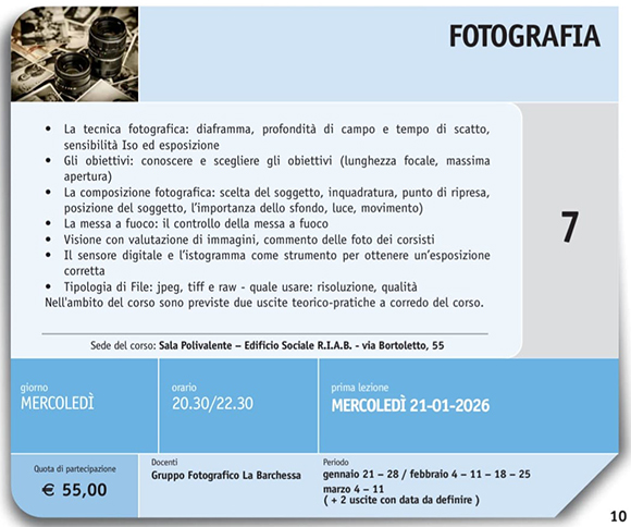 - Sono aperte le iscrizioni al Corso di Fotografia che si svolgerà in 8 lezioni e due uscite teorico-pratiche dal 21 gennaio al 11 marzo 2026. Info qui